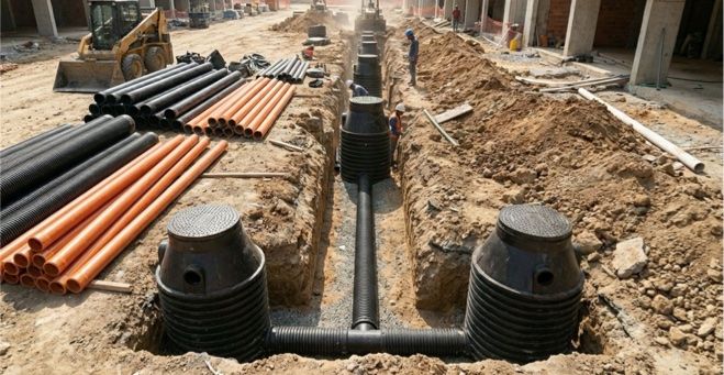 Soluciones en PEAD liso y corrugado para redes hidráulicas y pluviales en proyectos de infraestructura urbana.